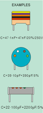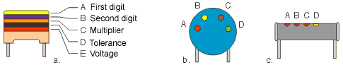 Fig. 2.1: Block capacitors Most of the capacitors, block-capacitors included, are non-polarized components, meaning that their leads are equivalent in respect of the way the capacitor can be placed in a circuit. Electrolytic capacitors represent the exception as their polarity is important. This will be covered in the following chapters. 2.1.1 Marking the block-capacitors Commonly, capacitors are marked by a set of numbers representing the capacity. Beside this value is another number representing the maximal working voltage, and sometimes tolerance, temperature coefficient and some other values are printed as well. But on the smallest capacitors (such as surface-mount) there are no markings at all and you must not remove them from their protective strips until they are needed. The size of a capacitor is never an indication of its value as the dielectric and the number of layers or "plates" can vary from manufacturer to manufacturer. The value of a capacitor on a circuit diagram, marked as 4n7/40V, means the capacitor is 4,700pF and its maximal working voltage is 40v. Any other 4n7 capacitor with higher maximal working voltage can be used, but they are larger and more expensive. Sometimes, capacitors are identified with colors, similar to the 4-band system used for resistors (figure 2.2). The first two colors (A and B) represent the first two digits, third color (C) is the multiplier, fourth color (D) is the tolerance, and the fifth color (E) is the working voltage. With disk-ceramic capacitors (figure 2.2b) and tubular capacitors (figure 2.2c) working voltage is not specified, because these are used in circuits with low DC voltage. If a tubular capacitor has five color bands on it, the first color represents the temperature coefficient, while the other four specify the capacity in the previously described way.