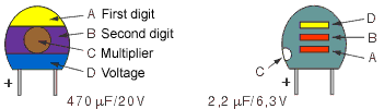 Fig. 2.2: Marking the capacity using colors The figure 2.3 shows how the capacity of miniature tantalum electrolytic capacitors are marked by colors. The first two colors represent the first two digits and have the same values as with resistors. The third color represents the multiplier, to get the capacity expressed in µF. The fourth color represents the maximal working voltage.