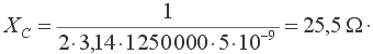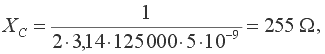 f representing the frequency in Hz and C representing the capacitance in Farads. For example, 5nF-capacitor's reactance at f=125kHz equals: