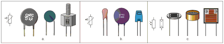 Fig. 1.4: Nonlinear resistors - a. NTC, b. PTC, c. LDR