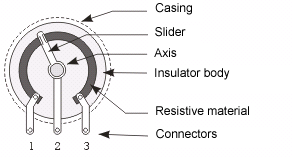 Fig. 1.6a: Coated potentiometer Wire-wound potentiometers are made of conductor wire coiled around insulator body. There is a slider moving across the wire, increasing the resistance between slider and one end of pot, while decreasing the resistance between slider and the other end of pot. Coated pots are much more common. With these, resistance can be linear, logarithmic, inverse-logarithmic or other, depending upon the angle or position of the slider. Most common are linear and logarithmic potentiometers, and the most common applications are radio-receivers, audio amplifiers, and similar devices where pots are used for adjusting the volume, tone, balance, etc. Wire-wound potentiometers are used in devices which require more accuracy in control. They feature higher dissipation than coated pots, and are therefore in high current circuits. Potentiometer resistance is commonly of E6 series, including the values: 1, 2.2 and 4.7. Standard tolerance values include 30%, 20%, 10% (and 5% for wire-wound pots). Potentiometers come in many different shapes and sizes, with wattage ranging from 1/4W (coated pots for volume control in amps, etc) to tens of watts (for regulating high currents). Several different pots are shown in the photo 1.6b, along with the symbol for a potentiometer.