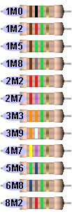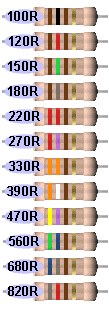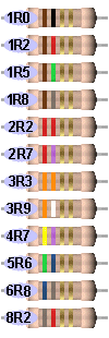 Fig. 1.2: b. Four-band resistor, c. Five-band resistor, d. Cylindrical SMD resistor, e. Flat SMD resistor The following shows all resistors from 0R1 (one tenth of an ohm) to 22M: