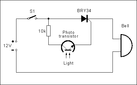 6.1 Practical examples Picture 6.5 detects when light is present in a room. With no light, the photo-transistor does not conduct. When light is present, the photo-transistor conducts and the bell is activated. Turning off the light will not stop the alarm. The alarm is turned off via S1.