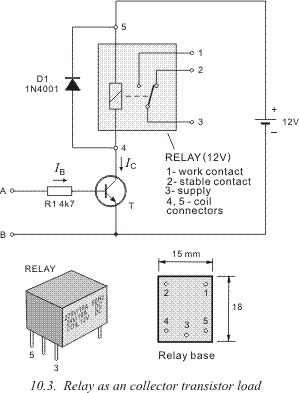 A relay can be connected as the collector load of a transistor, as shown on 10.3.
