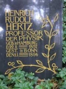 Hertz suffered from a bone disease during Summer 1892. Heinrich Hertz died of blood poisoning on 1 January 1894 in Bonn, when not quite 37. His tragic early death occurred after several years of poor health and cut short a brilliant career. He is buried in the Jewish cemetery in Ohlsdorf, Hamburg, Germany. Photographs of Heinrich Hertz's gravestone in the cemetery of Hamburg-Ohlsdorf, Germany. |