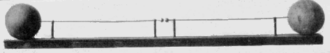 In his experiments, Hertz first employed a pair of one meter wires with a spark gap in the center connected to an induction coil as a radiator. The large spheres at the ends were used to adjust the capacity of the circuit for resonance. His receiver was a loop of wire with a small gap across which a small spark could be observed when the radiator discharged. The receiver was placed several yards from the oscillator. When these rods were given charges of opposite signs, strong enough to spark, the current would oscillate back and forth across the gap and along the rods. With this oscillator, Hertz solved two problems: 1) timing Maxwell's waves (he had demonstrated, in the concrete, what Maxwell had only theorized: that the velocity of radio waves was equal to the velocity of light), and 2) how to make the electric and magnetic fields detach themselves from wires and go free as Maxwell's waves. |