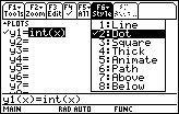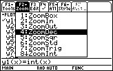 . It can be accessed in the catalog, or you can type it in using alpha. The value of the function is the greatest integer less than or equal to x. So, f(1)=1 and f(1.4)=1. Since this is a piecewise function you should use the Dot mode.