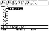 , and there will be a vertical asymptote of x=-3. Therefore, you will not be concerned with values of x less than -3. Consider this when you determine your window. It appears that the graph just stops, but it does not. The reason it has this appearance is because of the pixels. You can find the log function using the catalog.